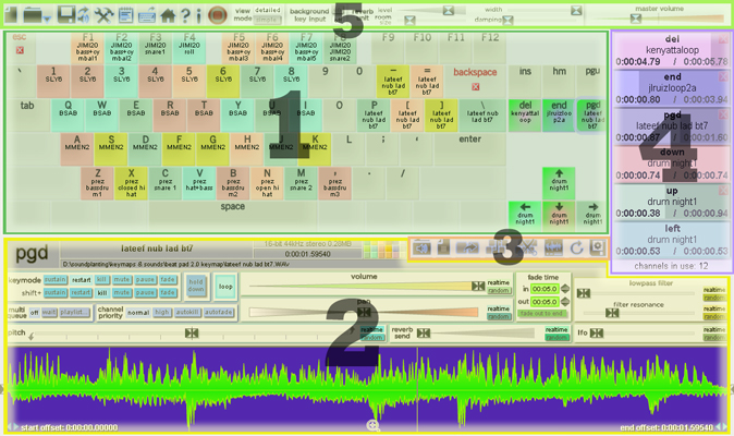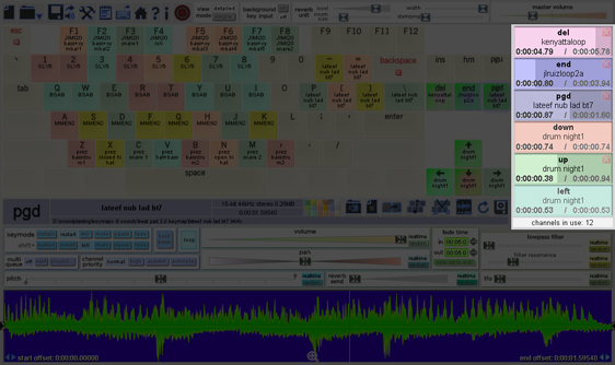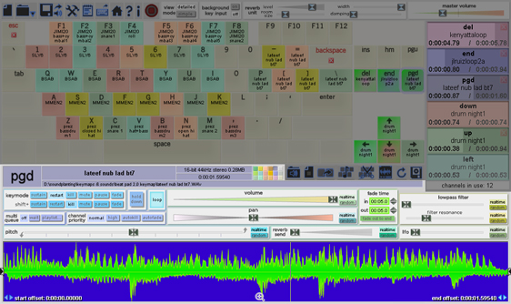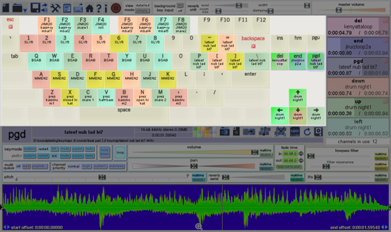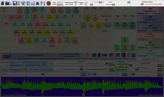 In the lower portion of the screen, key configuration options control how a key starts and kills sounds, realtime effects can be set, and information about the sound is displayed, including a visualization of its waveform. Each of the 72 assignable keyboard keys can have its own unique configuration. To select a key for configuration, do any of the following: