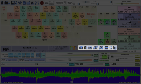 The waveform display shows an overview of the sound's waveform. While the sound is playing, a moving white playhead indicates the playback position of the most recent trigger instance of the key, and you can click anywhere along the highlighted part of the waveform to seek the playhead to that point in the sound. For stereo sounds, the top half of the waveform represents the left channel, and the bottom half represents the right. The waveform display includes controls for setting the sound's start offset and end offset. This allows limiting the portion of the sound that is played when the key is pressed; use offsets to, for example, trim silence, remove an unwanted song introduction, refine a loop, or extract individual sounds out of a larger track (see the offset assign function below for a quick automatic way to splice portions of a sound across multiple keys). Define start and end points using the left and right sliders, or more precisely by entering zoom view to edit offset points in a full screen zoomable version of the waveform, or by using the clickable arrow buttons along the bottom which allow adjusting to the 100,000th of a second. Offset changes are applied in realtime allowing start and end points to be adjusted while playing the sound, especially handy when adjusting loop points (note: when multiple keys are selected, offset changes are not realtime updated). ▰ Double-click the waveform to reset the offset selection back to the entire length of the sound. While the sound is not playing, click and drag anywhere in the highlighted part of the waveform to move both the start and end points simultaneously. While the sound is playing, if desired you can still drag the start and end points simultaneously by holding down shift while clicking the highlighted part of the waveform to allow selection dragging instead of playback position seeking. Normally the waveform playhead shows the playback progress of the most recently triggered instance of the sound, but if multiple overlapping instances of the key's sound have been triggered, and you want the playhead to reflect a particular instance other than the last one pressed, click on that instance in the Channels Meter to set the playhead to reflect that instance.