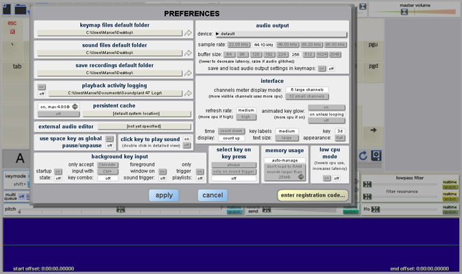 enter registration code... brings up a code entry dialog where you can enter the license code you receive when you purchase Soundplant in order to unlock the registered features. Follow the instructions given to you with your purchase to activate your registration. Once the program is registered, this button becomes remove registration....