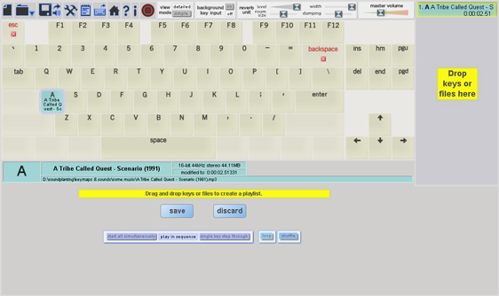 Sound files can be dragged from any folder window in Explorer (Windows) or Finder (Mac) and dropped over any unassigned key. If multiple files are dropped, then all dropped files will be assigned to successive keys on the keyboard, starting from the key under the mouse and moving from left to right and top row to bottom row.