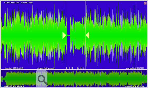 zoom view displays the waveform in a detailed full screen mode, hiding all other controls and enabling more precise setting of start and end offsets and examining of sound properties: