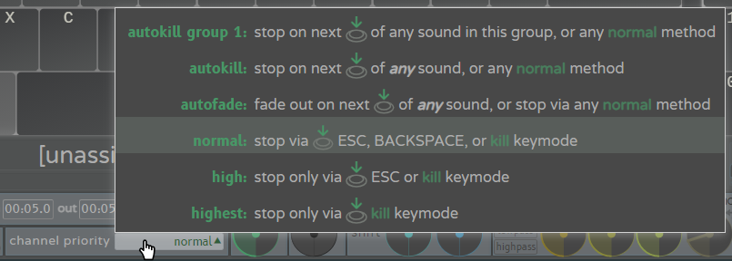 The channel priority setting enables fine tuning the manner in which sounds are killed automatically by Soundplant. This setting has no effect on the behavior of a key's individual 'kill' keymode for explicitly killing single sounds, but it does effect the behavior of the global silence keys Escape and Backspace/Mac Delete, and it can be used to set specific keys to kill other keys. It has the following options: