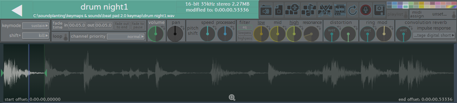 The waveform display at bottom shows an overview of the sound's waveform. While the sound is playing, a moving playhead indicates the playback position of the most recent trigger instance of the key, and you can click anywhere along the highlighted part of the waveform to seek the playhead to that point in the sound. The waveform display includes controls for setting the sound's start offset and end offset. This allows limiting the portion of the sound that is played when the key is pressed; use offsets to, for example, trim silence, remove an unwanted song introduction, refine a loop, or extract individual sounds out of a larger track (see the slice multi-key function for a quick automated way to splice portions of a sound across multiple keys). Define start and end points using the left and right sliders, or more precisely by entering zoom view to edit offset points in a full screen zoomable version of the waveform. Offset changes are applied in realtime allowing start and end points to be adjusted while playing the sound, especially handy when adjusting loop points. Along the bottom of the waveform, the start offset and end offset positions are shown; note that these value are relative to the duration of the sound at its default normal speed and won't reflect any speed changes made with pitch shift. Double click the waveform to reset the offset selection back to the entire length of the sound.