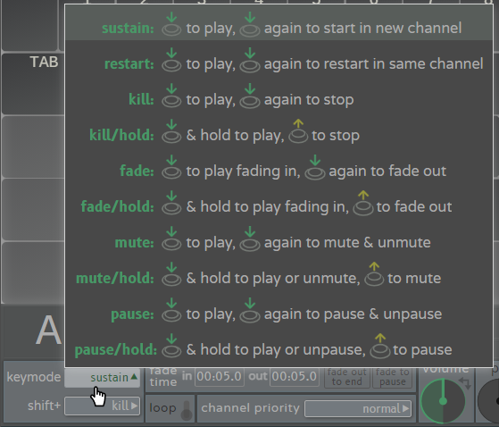 keymode and shift+ mostly affect how Soundplant will respond if the key is pressed or released after the assigned sound has already been triggered and is still playing. It's important to understand that if the key's sound is not yet playing, then pressing the key will always start its sound regardless of which keymode is set. 'shift+' controls the behavior of the key if pressed in combination with the Shift key, allowing the flexibility of an additional keymode function on the same key.