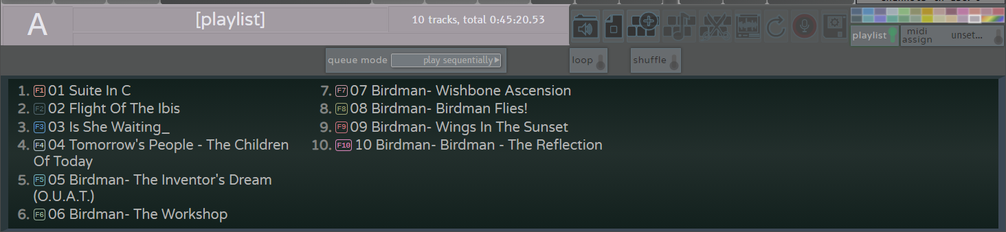Click and drag already-loaded sounds from onscreen keyboard keys in the into the desired position in the playlist, or drop in sound files from an Explorer or Finder window. To reorder the list, click and drag sounds in the playlist to new positions; to remove an item from the list, drag and drop the sound outside of the playlist area. You can load new sound files while in playlist editing mode by dropping files either onto specific keys or onto the playlist itself, or by using the open sound button on the Key Function Toolbar; if using 'open sound' or dropping files directly into the playlist, the selected sound file(s) will be automatically appended to the current playlist and assigned to the first available keyboard key(s) starting from F1. Playlist tracks display with their list position number followed by their source key and then track name. All items in a playlist play according to their individual key configuration settings including keymode and effects settings; there are no playlist-global effects. As you edit the list, the total length of the list is displayed. While in playlist editing mode, you can still press keys to trigger sounds as normal. When a key has a playlist assigned to it, a playlist icon appears in the upper right corner of the onscreen key. To jump to a playlist sound's key configuration for editing, double click any playlist item. To select all keys whose sounds are in the playlist simultaneously for bulk editing, double click any empty portion of the playlist area (anywhere that does not contain a track).