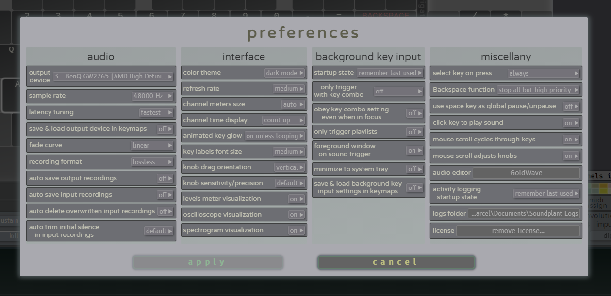 background key input enables Soundplant to respond to keys while its window is not in focus. This powerful feature opens many possibilities as it allows triggering Soundplant sounds while using other audio software, or while typing a document, or while using another instance of Soundplant with a different keymap loaded, or while doing anything in any other program, even if Soundplant is minimized, hidden, or behind other program windows. Additionally, in the background key input Preferences, Soundplant can be set to only respond to background key input if a modifier key combo such as Ctrl/Alt/Option is pressed. By default, the background key input state persists after quitting, such that if left on, the next time Soundplant is launched background key input will still be on, but this can be changed in the Preferences. On Windows, when 'background key input' is on, a Soundplant icon appears in the system tray. If 'background key input' is on, at any time you can hit the panic key combo Ctrl+Meta+Shift+Escape (Ctrl+Win+Shift+Escape on Windows or Ctrl+⌘+Shift+Escape on Mac) to immediately turn off 'background key input' and kill all sounds, regardless of whether the windows is in focus, in all currently running instances of Soundplant. On Windows, the Soundplant 'background key input' system tray icon can be clicked to toggle the visibility of the Soundplant window and hide Soundplant entirely from the taskbar (yes, this can be used to play tricks on people by running Soundplant in the background without them noticing!). 'background key input' is available in the registered version only.