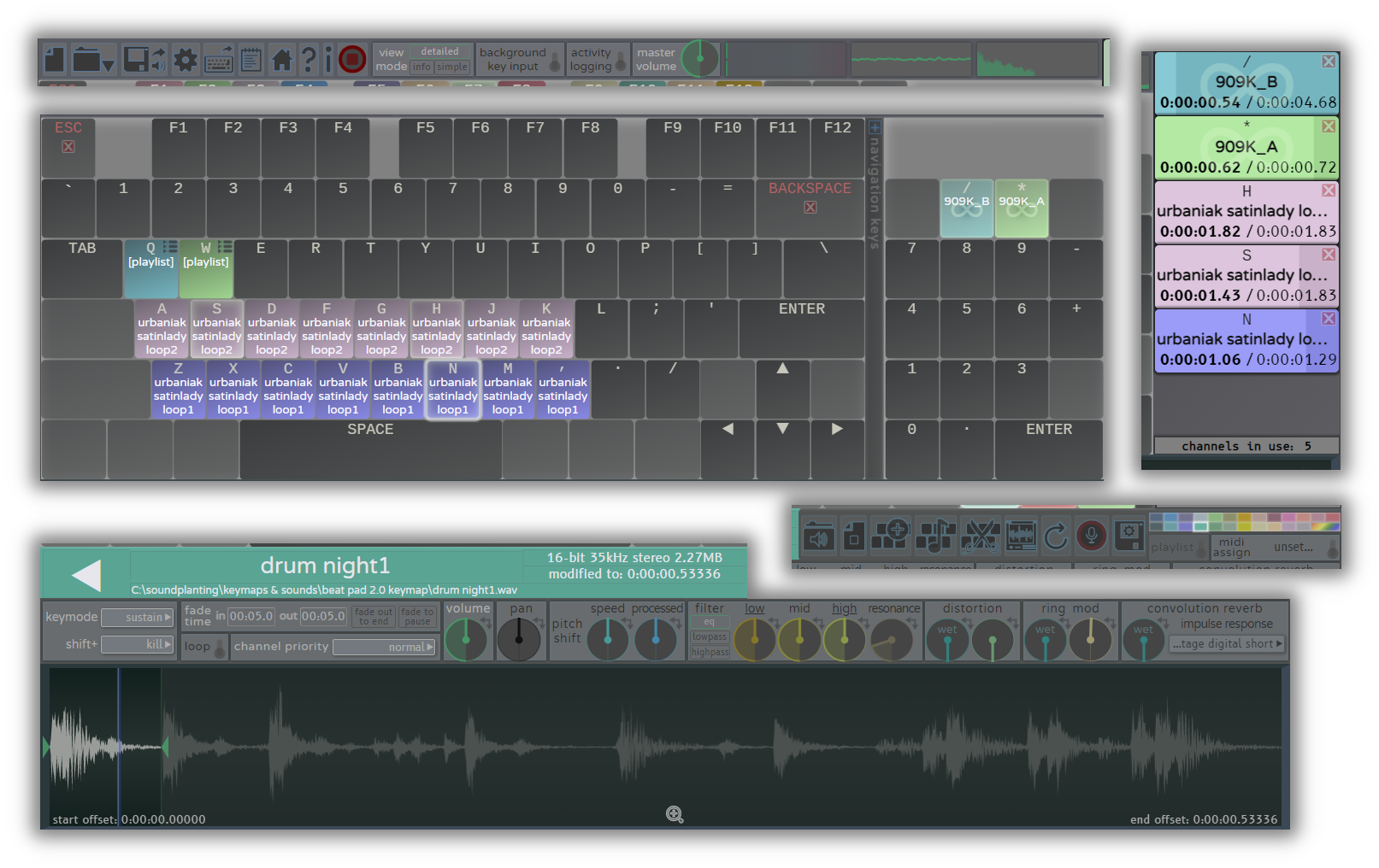 Soundplant is live performance audio software that turns your computer keyboard (yes, your QWERTY keyboard) into a versatile, low latency, multitrack sample trigger and playable musical instrument. It allows the assignment of sound files of any format and length onto virtually all keyboard keys, giving you hours of instantly-playing random access audio at your fingertips with no extra hardware needed. Use Soundplant as a performance, presentation, or installation tool, as a drum pad, as an educational aid, to mix together tracks in realtime, trigger sound effects or background tracks during a show, create music or loops, sketch sound designs, make beats, and give new life to old sounds - all via an input device you've been practicing on for as long as you've been typing. Because it's a standalone software sampler that uses your own samples to create custom soundboards, Soundplant is an infinitely flexible electronic instrument limited only by the variety of sounds that you feed it. An easy to use interface provides drag & drop configuration of each key, including options which control the way each sound is triggered along with several realtime effects. Playing sounds are displayed with a progress bar and track time, and you can even trigger sounds with Soundplant hidden while using any other program.