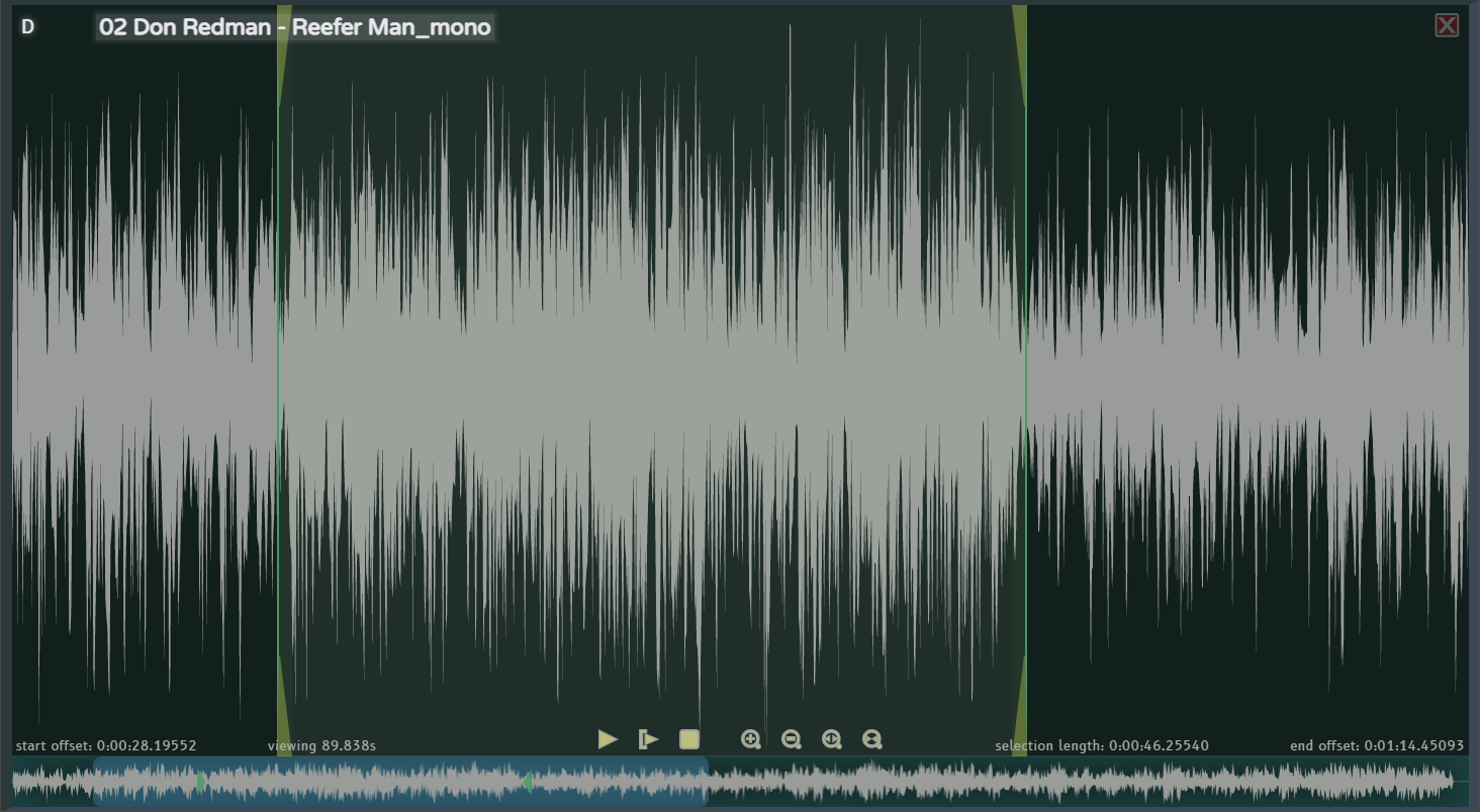 The waveform display at bottom shows an overview of the sound's waveform. While the sound is playing, a moving playhead indicates the playback position of the most recent trigger instance of the key, and you can click anywhere along the highlighted part of the waveform to seek the playhead to that point in the sound. The waveform display includes controls for setting the sound's start offset and end offset. This allows limiting the portion of the sound that is played when the key is pressed; use offsets to, for example, trim silence, remove an unwanted song introduction, refine a loop, or extract individual sounds out of a larger track (see the slice multi-key function for a quick automated way to splice portions of a sound across multiple keys). Define start and end points using the left and right sliders, or more precisely by entering zoom view to edit offset points in a full screen zoomable version of the waveform. Offset changes are applied in realtime allowing start and end points to be adjusted while playing the sound, especially handy when adjusting loop points. Along the bottom of the waveform, the start offset and end offset positions are shown; note that these value are relative to the duration of the sound at its default normal speed and won't reflect any speed changes made with pitch shift. ▰ Double click the waveform to reset the offset selection back to the entire length of the sound.