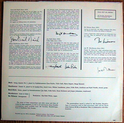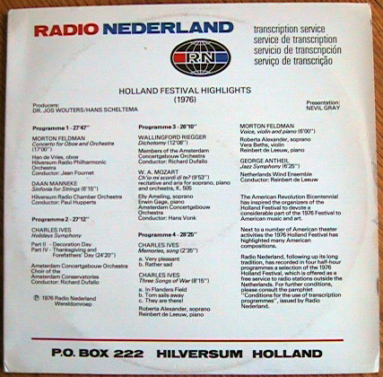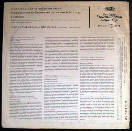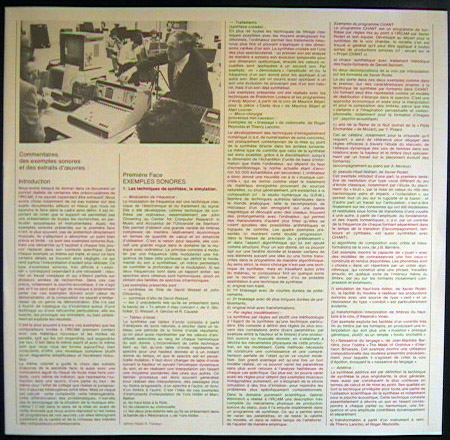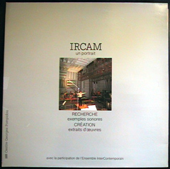 Private pressing issued by l'Institut de Recherche et Coordination Acoustique/Musique as a document of their ongoing research into sound. Side 1 contains "sound examples," a beautiful montage of demonstrations of then state-of-the-art synthesis methods, sound experiments, newly invented electronic instruments, digital audio processing techniques, and psychoacoustic phenomenon; there are some extremely unusual sounds including computer-generated and digitally-processed speech and vocal noises, studies in spatial/stereo effects and microtonal scales, and mutated virtual instruments which morph different properties of multiple instruments into a single sound source. Contributors to this side include most of the other composers on this disc plus Maurice Bejart, Vinko Globokar, Roger Reynolds, Harrison Birtwistle, Jean-Baptiste Barriere, and many others. Side 2 features works by IRCAM residents (some tracks are excerpts) ranging from purely electronic works to live instrumental pieces incorporating realtime electronic processing. Performers include the Ensemble InterContemporain directed by Peter Eotvos as well as Boulez, soprano Jane Manning, and contrabassist Barry Guy.